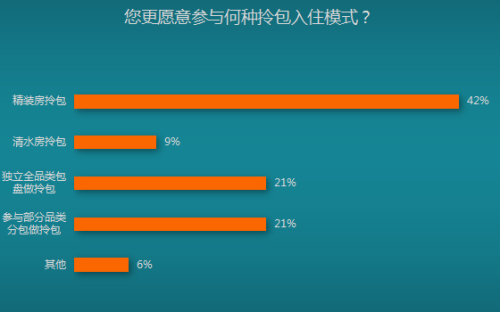 此次調(diào)查的經(jīng)銷商群體中,70%的經(jīng)銷商沒有做過拎包入住項(xiàng)目的經(jīng)驗(yàn);42%的經(jīng)銷商更愿意選擇做精裝房拎包,其次是獨(dú)立全品類包盤做拎包和參與部分品類分包做拎包。