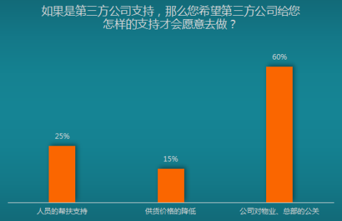 通過調(diào)查發(fā)現(xiàn),經(jīng)銷商不愿意做拎包入住項(xiàng)目的原因主要是擔(dān)心需要投入的費(fèi)用太高和激烈競(jìng)爭(zhēng)下沒有專業(yè)人士指導(dǎo)做拎包。同時(shí),對(duì)于第三方公司支持的拎包入住項(xiàng)目,60%的經(jīng)銷商們希望獲得公司對(duì)物業(yè)和總部的公關(guān)需求。