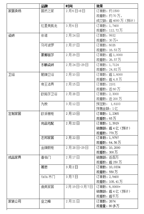 從時間來看,各大家居品牌紛紛在2月份已轉型線上直播賣貨,累計開展了過萬場直播,其中,在2月底以及315前后這兩個時間段,曾出現(xiàn)多個家居品牌扎堆直播的現(xiàn)象。