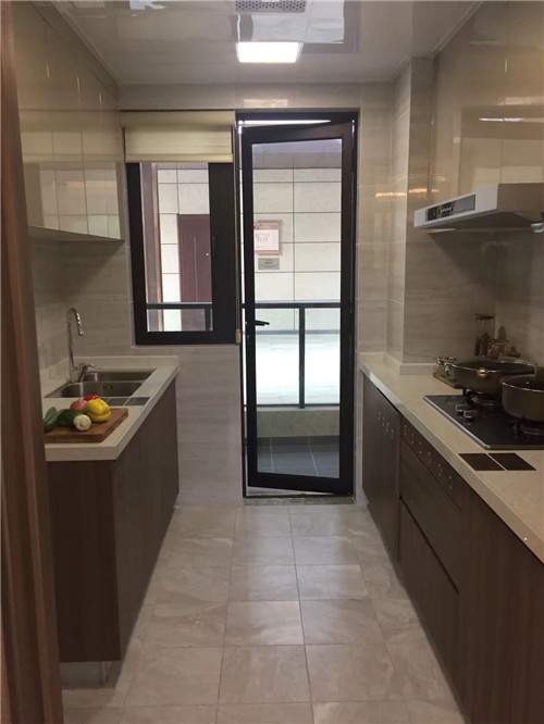 ☝ 中式廚房煎炸烹飪油煙大,多采用封閉式處理,為了讓空間更顯開闊和通透,利用玻璃推拉門搭配深木色的邊框,將中式的韻味貫通其中。嵌入式家電設(shè)計(jì),融入柜體之中,整體性更強(qiáng),干凈利落。