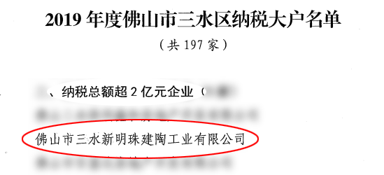 4月14日,佛山市三水區(qū)人民政府辦公室發(fā)布“佛山市三水區(qū)人民政府關(guān)于2019年度三水區(qū)納稅大戶的通報(bào)”,對(duì)三水區(qū)2019年納稅大戶名單進(jìn)行了公布。新明珠陶瓷集團(tuán)旗下三水園區(qū)(佛山市三水新明珠建陶工業(yè)有限公司)以納稅超2億元成功上榜,在建筑衛(wèi)生陶瓷企業(yè)中排名第一。