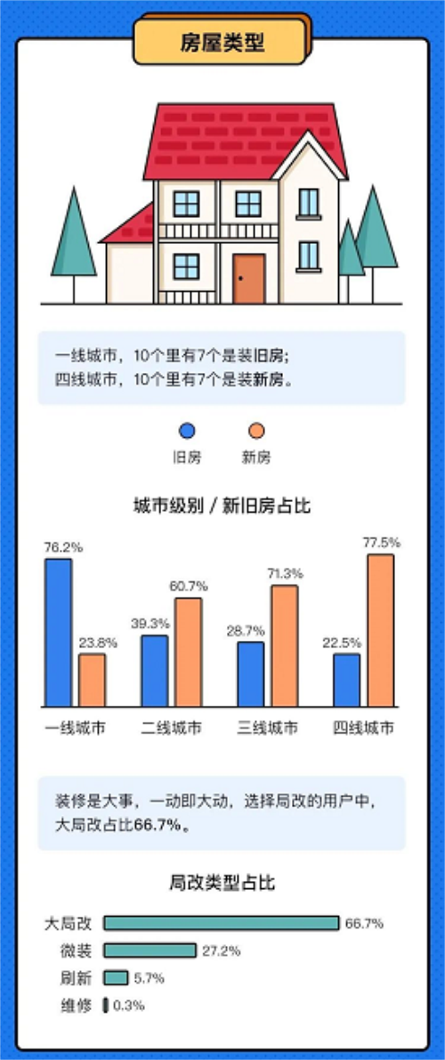 這讓我想到后疫情時(shí)代一篇家庭裝修報(bào)告,報(bào)告得出,舊房改造未來是一線城市裝修的重點(diǎn);建材裝修材料行業(yè)對(duì)此應(yīng)該有所準(zhǔn)備。為何會(huì)這樣說?根據(jù)土巴兔大數(shù)據(jù)研究院最新發(fā)布的一份《后疫情時(shí)代家庭裝修報(bào)告》。報(bào)告顯示的一些關(guān)于裝修的數(shù)據(jù),可能與很多人的想象不大一樣。其中:一線城市每10個(gè)用戶中有7個(gè)是在翻新舊房,而四線城市與其正好相反,每10個(gè)用戶中有7個(gè)是在為新房做裝修。而在二、三線城市,用戶新舊房占比仍是以新房為主。這次的大數(shù)據(jù)報(bào)告還顯示在主導(dǎo)裝修性別占比上,男性用戶以54.9%,稍高于女性的45.1%。