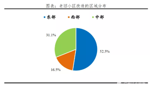 目前我國重點(diǎn)一二線城市存量住宅普遍進(jìn)入“老齡化”階段,城市內(nèi)存量住宅中,15年以上樓齡占比超35%且20年以上樓齡占比超20%的城市有12個(gè),均為發(fā)展起步早、能級(jí)高的重點(diǎn)一二線城市。7月份國務(wù)院《關(guān)于全面推進(jìn)城鎮(zhèn)老舊小區(qū)改造工作的指導(dǎo)意見》,明確指出我國這次老舊小區(qū)改造至少將投入4.54萬億元或可達(dá)5萬億元。此前根據(jù)住建部摸排結(jié)果,全國2000年以前建成的老舊小區(qū)近17萬個(gè)、涉及居民上億人、超4200萬戶、建面約40億平。分區(qū)域看,根據(jù)2010年第六次人口普查數(shù)據(jù)估算,東部省市老舊小區(qū)改造規(guī)模最大,占比約52.5%;中部次之,占比約31.1%;西部最少,占比約16.5%。2020年4月國常會(huì)明確,2020年改造項(xiàng)目3.9萬個(gè),涉及居民近700萬戶,比2019年增加一倍。