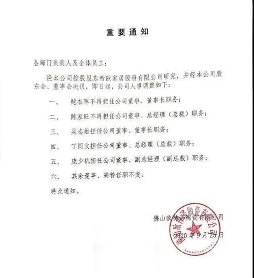 據(jù)業(yè)內(nèi)消息透露,9月25日,歐神諾下發(fā)了一份重要通知:經(jīng)本公司控股股東帝歐家居股份有限公司(以下簡(jiǎn)稱“帝歐家居”)研究,并經(jīng)本公司股東會(huì)、董事會(huì)決議,即日起,公司人事調(diào)整如下:鮑杰軍不再擔(dān)任公司董事、董事長(zhǎng)職務(wù);陳家旺不再擔(dān)任公司董事、總經(jīng)理(總裁)職務(wù);吳志雄擔(dān)任公司董事、董事長(zhǎng)職務(wù);丁同文擔(dān)任公司董事、總經(jīng)理(總裁)職務(wù);龐少機(jī)擔(dān)任公司董事、副總經(jīng)理(副總裁)職務(wù);其余董事、高管任職不變。