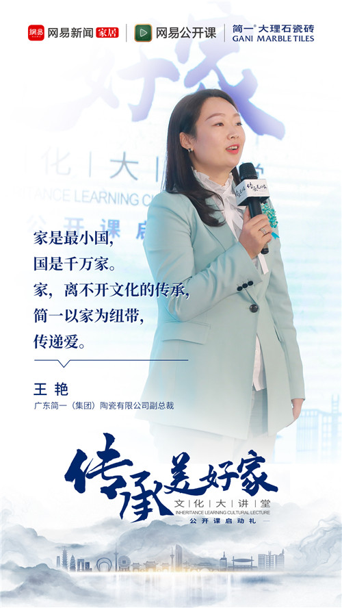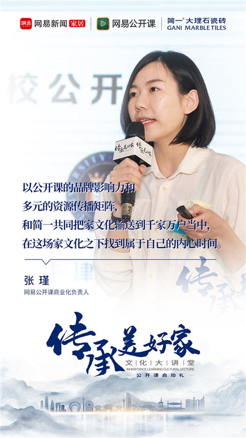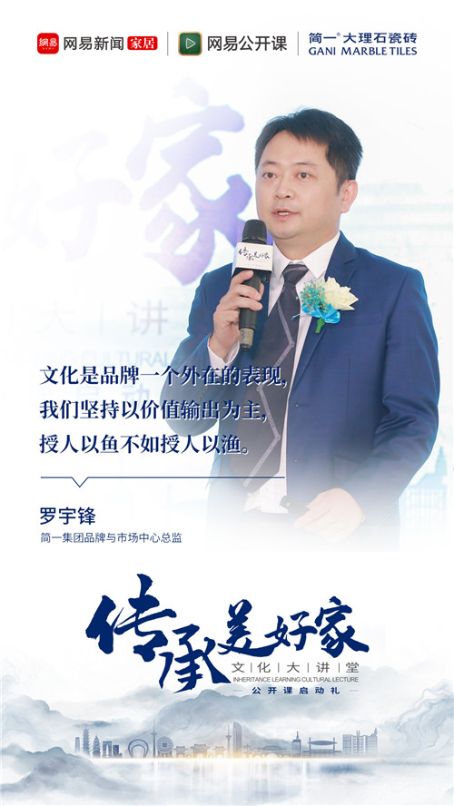 中華教育文化源遠(yuǎn)流長,博大精深,網(wǎng)易公開課作為國內(nèi)門戶第一個(gè)在線教育品牌,致力于以公益態(tài)度打破教育藩籬,傳遞全人類的知識(shí)與智慧。網(wǎng)易家居作為一個(gè)有態(tài)度的門戶媒體,自成立以來一直致力于深耕泛家居行業(yè),以優(yōu)質(zhì)內(nèi)容為用戶創(chuàng)造價(jià)值。“公益共享、文化傳播、愛家愛生活”,這恰恰是簡一大理石瓷磚攜手網(wǎng)易公開課、網(wǎng)易家居聯(lián)合舉辦傳承美好家文化大講堂的連接點(diǎn)、共通點(diǎn)。