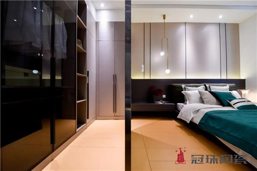 臥室里側(cè)就是衣帽間,設(shè)計師還用巖板的柜門做了分隔了,分開了男女區(qū)間,貼心又養(yǎng)眼!