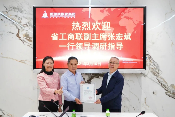 ▲張宏斌副主席(右一)為新明珠陶瓷集團(tuán)董事長(zhǎng)葉德林頒發(fā)證書