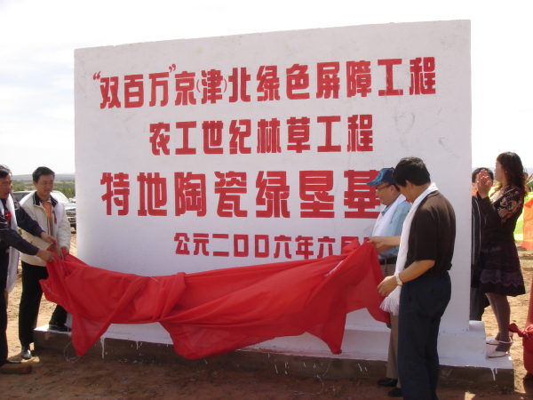 在北京成功申奧后,國(guó)家提倡要開(kāi)展不同形式的“綠色中國(guó)迎奧運(yùn)”的環(huán)保公益活動(dòng),在人人爭(zhēng)為綠色奧運(yùn)做貢獻(xiàn)的社會(huì)氛圍下,2006年由中國(guó)農(nóng)工民主黨內(nèi)蒙古自治區(qū)委員會(huì)倡導(dǎo):為保北京2008奧運(yùn),在“京(津)北”建一道最大的綠色屏障。那時(shí)特地雖已研發(fā)出可以?xún)艋諝獾慕】荡纱u,但是只能幫助我們凈化家里的空氣,特地得知此項(xiàng)目后立即響應(yīng),借此機(jī)會(huì)幫助社會(huì)凈化大環(huán)境,決定在內(nèi)蒙古自治區(qū)四子王旗的戈壁灘上建立“京(津)北”綠色屏障工程世紀(jì)林(草)特地綠墾基地(以下簡(jiǎn)稱(chēng)“特地綠墾基地”)。在京津冀地區(qū)北面的風(fēng)沙口種上植被防風(fēng)固沙,在源頭上杜絕風(fēng)起揚(yáng)塵,減少沙塵暴肆虐,為守護(hù)2008奧運(yùn)出一份力。