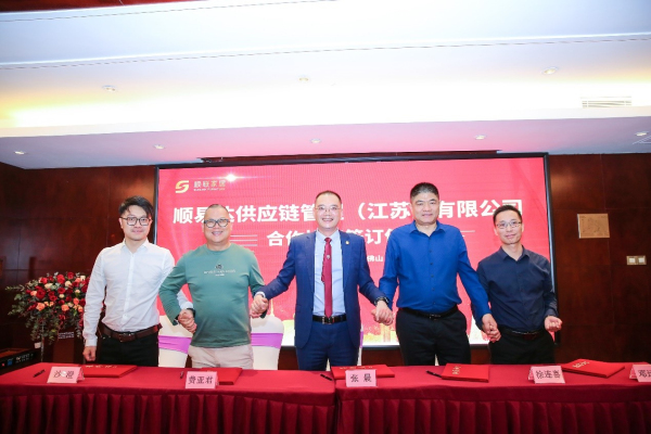 張晨先生、費(fèi)亞君先生、徐連喜先生、沙澄先生和鄧運(yùn)文先生,在現(xiàn)場(chǎng)簽署順易達(dá)供應(yīng)鏈管理(江蘇)有限公司的合作協(xié)議。