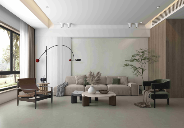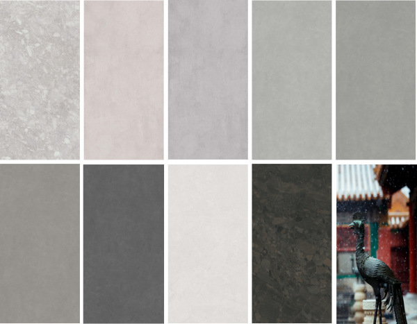 “國風(fēng)·時(shí)光”系列以其素凈的色彩符合當(dāng)下簡約的審美潮流,從色彩與質(zhì)感的完美結(jié)合中,將素色美學(xué)與質(zhì)感相結(jié)合的藝術(shù)美展現(xiàn)的淋漓盡致。9款花色糅合流行的灰調(diào)美學(xué),涵蓋冷暖調(diào)性,專注產(chǎn)品本身的質(zhì)感,用素色去詮釋一種純粹的、無雜質(zhì)的藝術(shù)體驗(yàn)。“霜序”、“花朝”兩款花色是帶暖調(diào)的灰,自帶柔和雅致;“云亭”、“盞茶”是自然懷舊的水泥淺灰,保留著微水泥的原始味道;“松煙”、“月竹”是深邃的灰調(diào),細(xì)節(jié)中滲透著高級的質(zhì)感;“云杉”以白為底,更顯輕盈通透;“荏苒”、“珠璣”的紋理如同被潮水洗刷的鵝卵石,粗獷紋理與細(xì)膩觸感兼具。產(chǎn)品于無聲處表達(dá)豁達(dá)的精神境界,與當(dāng)代簡約精煉的設(shè)計(jì)風(fēng)格找到融合點(diǎn),為空間打造簡單和微妙的美學(xué)氣質(zhì)。