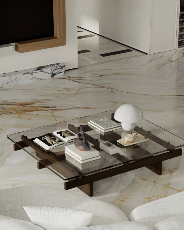 考慮到孩子們在家穿梭玩耍的需求,設(shè)計(jì)師打造了連通客廳的半開放書房,同時(shí)又通向中央走廊,大規(guī)格奢石巖板卡拉金花紋一路延伸到書房,增強(qiáng)了空間的連通感。