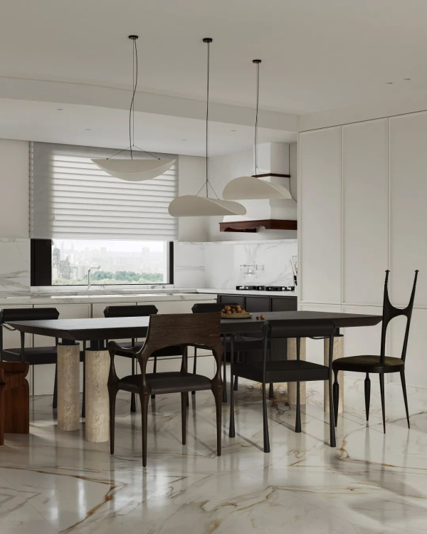 設(shè)計(jì)師將餐廳與客廳銜接開放,取消了傳統(tǒng)的隔斷設(shè)計(jì)思考,極大的增強(qiáng)空間的趣味互動(dòng),搭配直線圓弧的黑色系餐桌與細(xì)膩奢感的薩米特巴爾洛白紋理,給空間注入更多質(zhì)感。