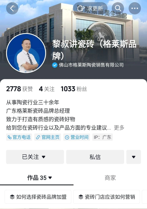 所有行業(yè)值得用數(shù)字化再做一遍,隨著數(shù)字化浪潮勢不可擋的發(fā)展態(tài)勢,傳統(tǒng)企業(yè)通過數(shù)字化、智能化的革新迎來新的挑戰(zhàn)和機遇。而隨著數(shù)字時代的到來,品牌的傳播陣地發(fā)生了改變,無論是B端還是C端,品牌都需將用戶價值及體驗做到深度數(shù)字化,通過人性化、社交化、內(nèi)容化給予用戶品牌全景體驗。從今年4月開始,格萊斯首創(chuàng)以品牌老總為IP塑造的招商藍V號“黎叔講瓷磚”,持續(xù)輸出品牌加盟、瓷磚行業(yè)資訊、門店營銷和裝修避坑等內(nèi)容為品牌發(fā)聲。