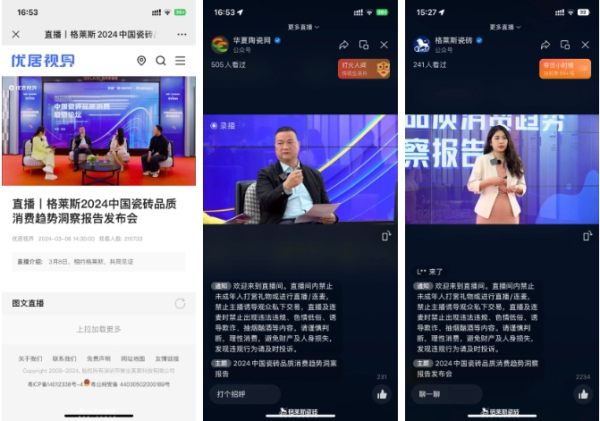 作為活動的高光點,消費趨勢報告發(fā)布會通過優(yōu)居視界網(wǎng)、微贊平臺、華夏陶瓷網(wǎng)視頻號、智造聯(lián)盟視頻號以及格萊斯瓷磚視頻號同步開播正式發(fā)布了 “2024中國瓷磚品質(zhì)消費趨勢洞察報告”。剖析中國瓷磚行業(yè)的消費現(xiàn)狀、洞察品質(zhì)消費趨勢,直播間人氣高漲,累計訪問量高達47.39w+。