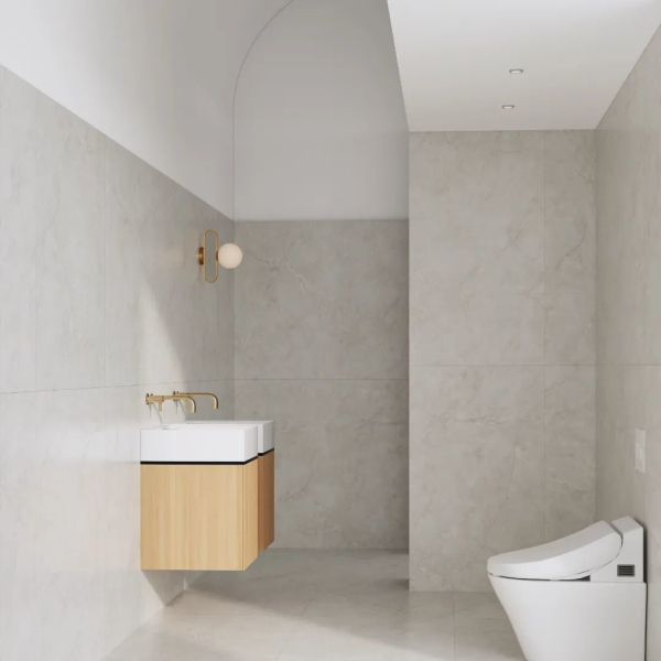 來(lái)到衛(wèi)浴空間,巴爾顏淺灰色的磚面配上自然石材紋理,賦予衛(wèi)浴空間無(wú)與倫比的自然生命氣息,窗外的陽(yáng)光沿著墻面這昂哈桑而下的慵懶傾灑在地面上,盡顯衛(wèi)浴的輕柔與美感。