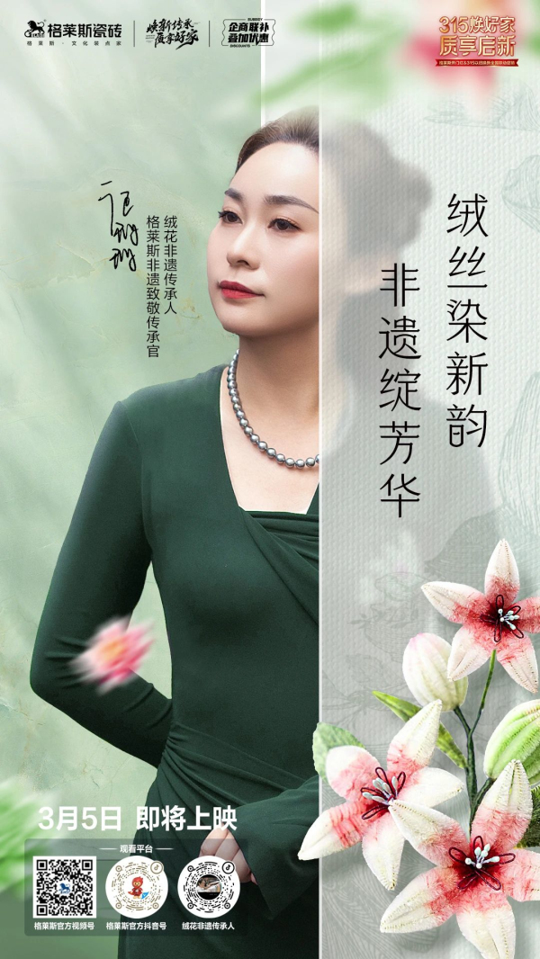 征珊珊老師制作絨花時的精益求精,如同格萊斯瓷磚對產(chǎn)品的細(xì)節(jié)雕琢、品質(zhì)嚴(yán)控,格萊斯堅持高標(biāo)準(zhǔn)嚴(yán)要求,每一款出廠的瓷磚產(chǎn)品都必須經(jīng)過AI質(zhì)測和人工復(fù)檢的雙重檢測,為的就是讓用戶買的放心,更用得安心。對匠心品質(zhì)的嚴(yán)謹(jǐn)態(tài)度,對文化傳承的責(zé)無旁貸,讓本次的合作一拍即合。