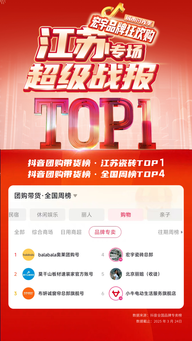 近日,宏宇陶瓷“品牌狂歡購”全國狂攬11356單,較去年同比增長135%,三度登頂抖音團購帶貨榜瓷磚榜TOP1,抖音總曝光3000萬+,超然戰(zhàn)績熱度爆表,以新零售模式交出了一份亮眼的營銷答卷。