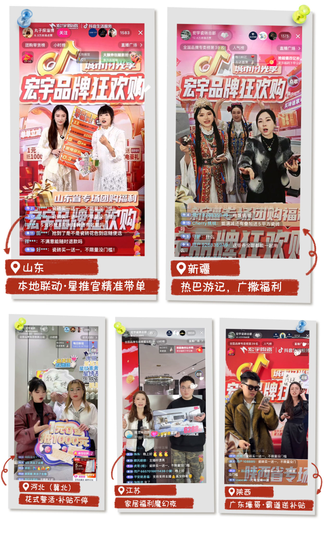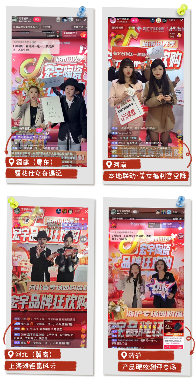 活動期間,宏宇陶瓷首創(chuàng)“星主播全國巡回直播”機制,自孵化主播團隊深入本地核心市場,以2003+小時直播時長構建區(qū)域流量池。宏宇陶瓷打造百變直播間:遼寧專場化身魔術師奇幻秀場,四川直播間上演方言砍價擂臺,山西蒙中借勢哪吒cosplay引爆流量,福建(粵東)復刻簪花仕女奇遇記,陜西則通過“廣東壕哥霸道補貼”等,以多元創(chuàng)意內容形成話題破圈,實現(xiàn)線上鎖客停留與線下轉化的高效聯(lián)動,成功點燃12省消費熱情。