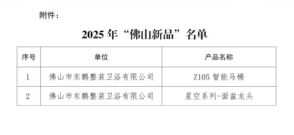 近日,佛山市工業(yè)和信息化局正式公布2025年"佛山新品"名單,東鵬憑借Z105智能馬桶與星空系列面盆龍頭兩款創(chuàng)新產(chǎn)品再度登榜。作為佛山市政府重點(diǎn)培育的權(quán)威獎(jiǎng)項(xiàng),"佛山新品"評(píng)選以創(chuàng)新性、技術(shù)領(lǐng)先性和市場前瞻性為核心維度,被譽(yù)為"佛山制造轉(zhuǎn)型升級(jí)的風(fēng)向標(biāo)"。東鵬連續(xù)多屆蟬聯(lián)該榮譽(yù),充分彰顯了企業(yè)在智能家居領(lǐng)域的持續(xù)創(chuàng)新動(dòng)能與技術(shù)積淀。