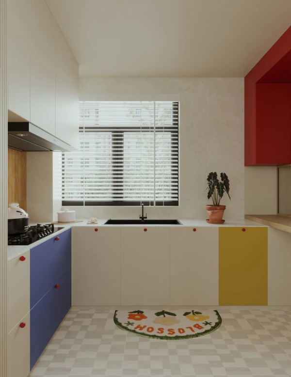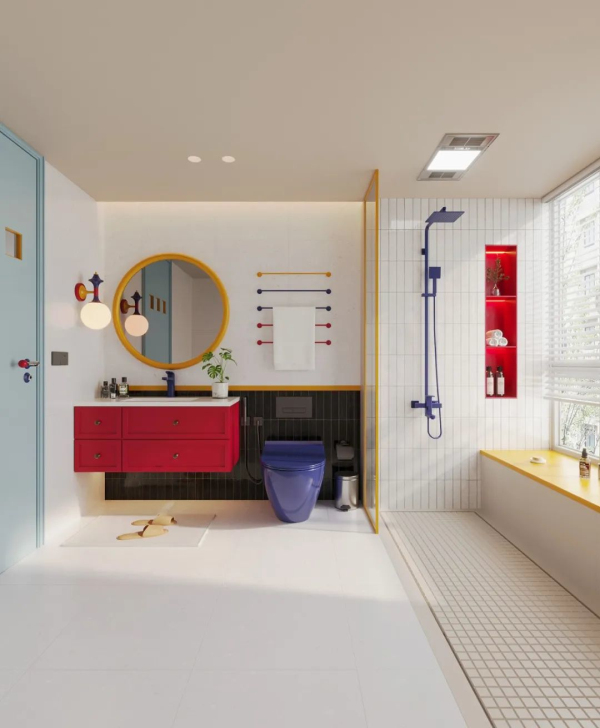 浴室以黑、白紋藝磚磚劃分干區(qū)、濕區(qū),干區(qū)地面鋪貼巖嶺,浴室地面用白色馬賽克地磚,為跳色的布置定下了鮮明的區(qū)域分隔。在此基礎(chǔ)上以紅黃藍(lán)色調(diào)的浴室裝置均勻分布,形成協(xié)調(diào)的跳色。走進(jìn)浴室,人的心情會(huì)瞬間明亮。