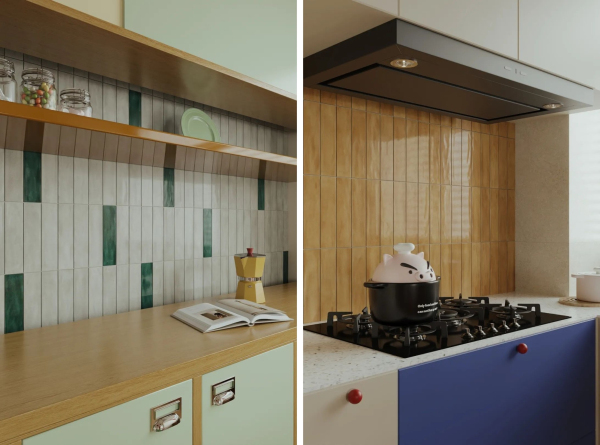 廚房則鋪1492-石韻系列-變奏,砂巖般的表面既復(fù)古又防滑;灶臺(tái)與餐邊柜背景墻則用紋藝磚,讓人瞬間回到上世紀(jì)的老式法國公寓,而亮色跳色的搭配又增加了玩世不恭的年輕態(tài)度。