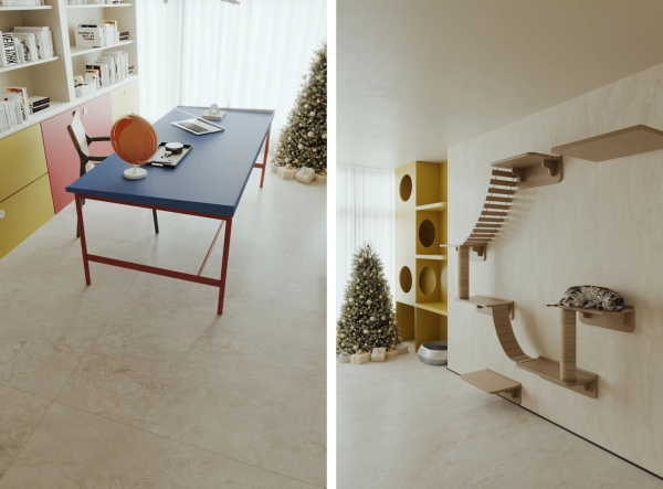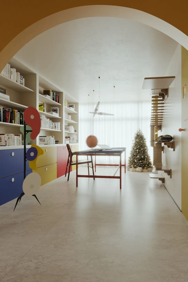 書房左邊做滿墻書柜,用紅黃藍(lán)的跳色做該空間的主色調(diào);右邊做滿墻寵物攀爬家和貓窩,背景墻采用客廳同款的象牙洞石巖板,為寵物提供舒適的視覺環(huán)境,同時(shí)也更耐臟、耐抓。