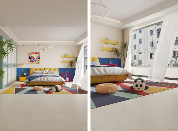 兒童房整體仍以簡約質(zhì)感的硬裝為基底,地面鋪貼伊曼米黃,營造復(fù)古的調(diào)調(diào),鋪上大面積的彩色跳色地毯與黃藍(lán)床頭設(shè)計(jì),整體視覺活力滿滿又不覺紛亂。