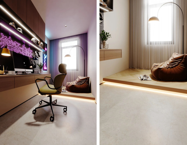 全屋留了一處靜謐的私人書房、電競房,畢竟人在全屋大面積的撞色環(huán)境中會(huì)持續(xù)亢奮,也需要冷靜的空間去換一種心情。私人書房地面鋪貼伊曼米黃,地臺(tái)鋪貼木里系列-藜麥,延續(xù)全屋的復(fù)古調(diào)調(diào),而又另辟沉穩(wěn)、適合辦公的空間分支。