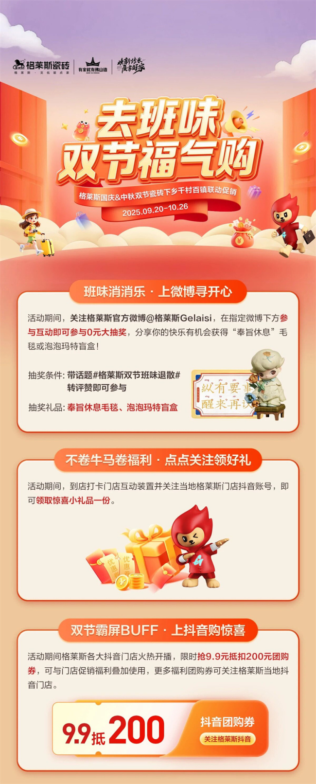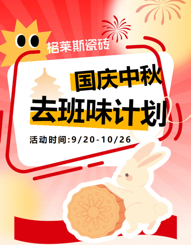 工位上缺的氧 在生活里補回來 國慶中秋將至 精神狀態(tài)很OK 格萊斯瓷磚 “去班味 雙節(jié)福氣購”大促 為你送上一大波班味消消好禮 開啟水靈靈的假期 跟WORK說拜拜。! 對HOLIDAY說嗨~~~