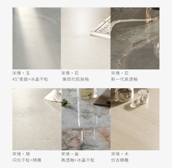 工藝之美:宋境系列擁有45°柔拋、肌膚釉、高透釉、閃光精雕、冰晶干粒、仿古精雕等等6大工藝,可打造與磚面紋理相匹配磚面肌理效果,為消費(fèi)者提供多樣的選擇。