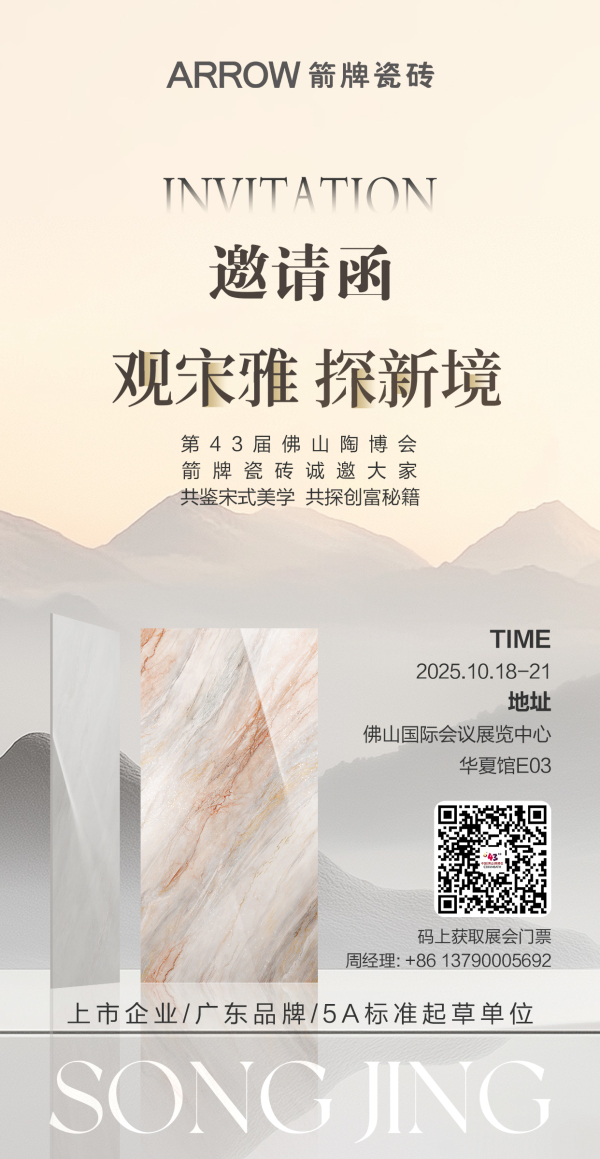 10月18日-10月21日,誠(chéng)邀您蒞臨佛山國(guó)際會(huì)議展覽中心華夏館E03展位,近距離感受箭牌瓷磚的產(chǎn)品魅力與品牌實(shí)力,探索人居空間美學(xué)的無限可能!