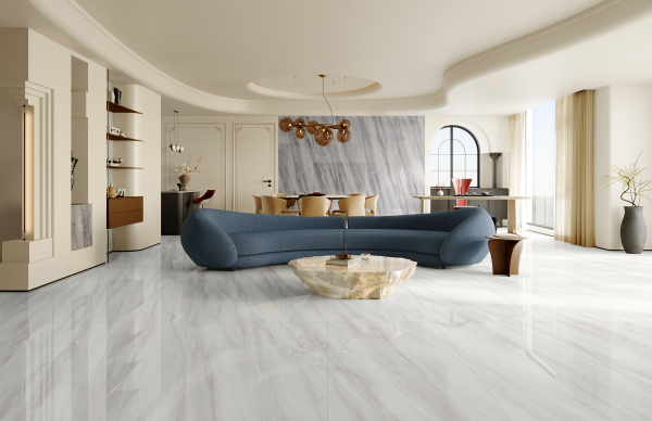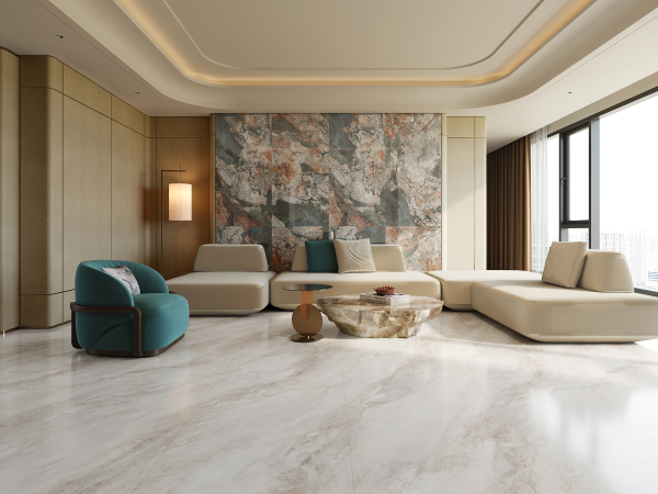 「宋境·玉」運(yùn)用45°柔拋工藝,讓磚面更加接近天然石材的光感,柔光質(zhì)感更加高級,用在客餐廳、臥室光感非常舒適;疊加了冰晶干粒,光感細(xì)節(jié)更加豐富精致。