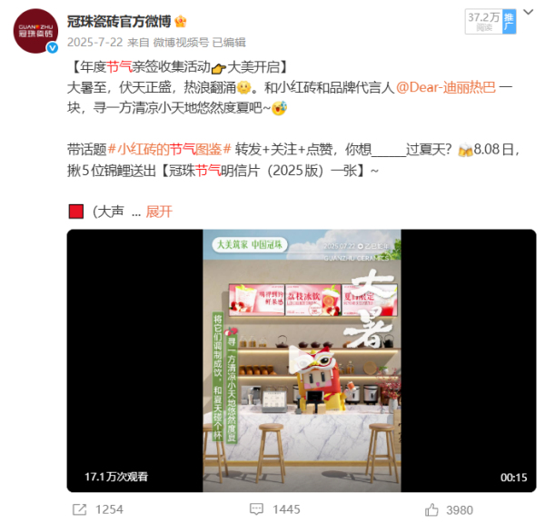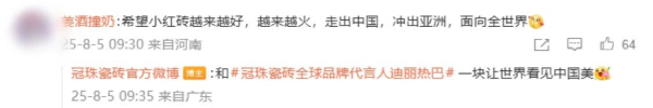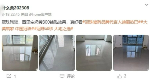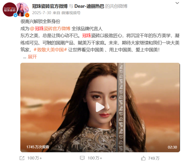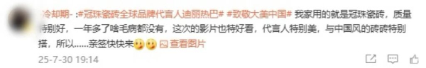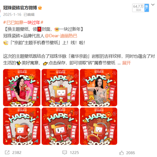冠珠瓷磚敏銳捕捉平臺用戶特質,以“用戶需求”為導向的系統(tǒng)化、年輕化運營策略,持續(xù)輸出高品質內容。2025年,冠珠瓷磚借勢全球品牌代言人迪麗熱巴的國民影響力,精準對話年輕群體,實現(xiàn)品牌熱度攀升,截止到2025年12月,“冠珠瓷磚官方微博”累計粉絲量達到185.7萬,#冠珠瓷磚全球品牌代言人迪麗熱巴#、#與迪麗熱巴一塊煥新家#等品牌話題閱讀量累計突破24.9億,實現(xiàn)品牌與年輕世代的深度共振。