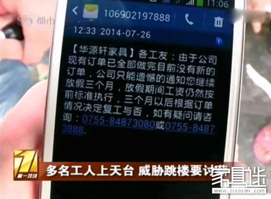 7月26日,華源軒家具的工人又收到短信,稱由于公司現(xiàn)有訂單已全部做完,目前沒有新的訂單,只能繼續(xù)放假3個月,放假期間工資仍然按前標準執(zhí)行,3個月后根據(jù)訂單情況決定復工與否。