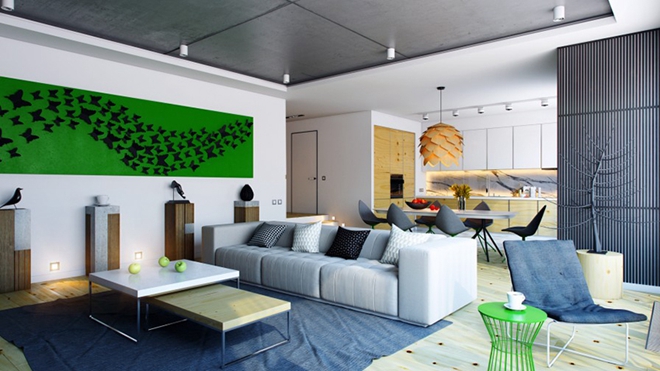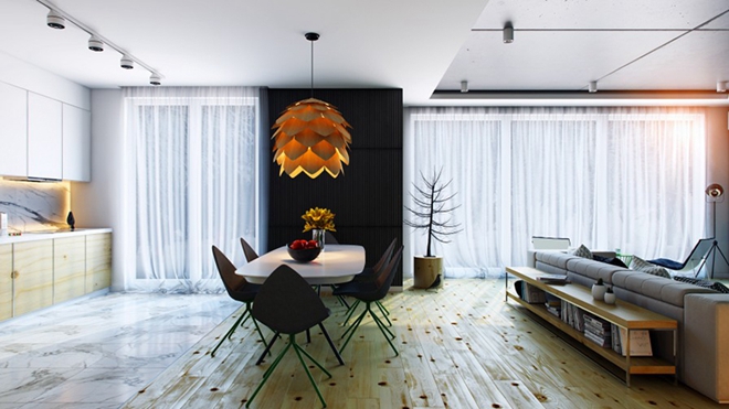 不妨參考看看俄羅斯設(shè)計(jì)公司Fedorova的這間公寓,利用灰褐色系與不同質(zhì)感的石材、木材混合搭配,中色調(diào)讓客廳整體統(tǒng)一。良好采光其實(shí)是創(chuàng)造室內(nèi)愉悅氣氛最好的來源,所以將餐桌與閱讀區(qū)直接安排在窗邊是非常好的方式,開放式廚房則位于客廳后方小巧的角落,既節(jié)省空間也比較不怕油煙飄散。