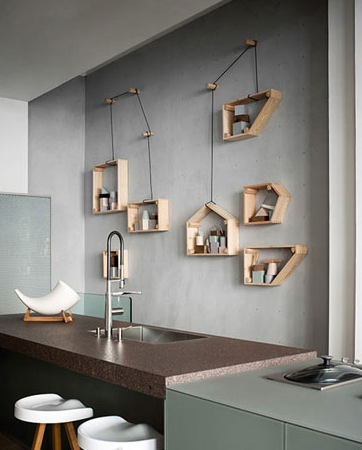小編點評:創(chuàng)意的框架掛飾不但能美化單調的背景墻,而且能用于調味品瓶子的存放,增加收納空間。凳子的凳面設計十分人性化。