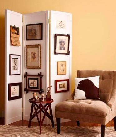 白色的屏風可以用來分割不同的功能區(qū),而這里的屏風僅作為一種沙發(fā)區(qū)背景來裝飾。屏風上再布置有愛寵的照片來展現(xiàn)生活的多姿多彩。兩者的結合,在碰撞中產(chǎn)生一種另類、別具一格的墻面裝飾效果。