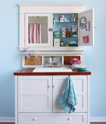 盥洗區(qū)上部分選用箱型鏡柜,除了有實質的功能外,里面還能收納各類洗浴用品。洗面盆下方的空間自然也不容忽視,洗臺盆嵌于柜體的款式收納效果最為理想,柜體具有分割層板設計,同時還具有隱藏管線的作用。