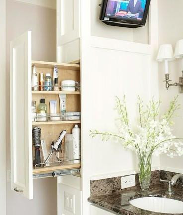 細長型的拉籃是畸零空間里的收納高手,輕薄的身板卻同時包羅眾多生活用品。防水板材的設計利用,有效地將衛(wèi)浴空間的濕氣排除在外,愛美的女性可以安心在其中放置電吹風機,卷發(fā)棒等電器產(chǎn)品。