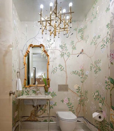 樹(shù)枝、花朵、鳥(niǎo)兒……這些充滿自然氣息的圖案帶給浴室清新視覺(jué),整體棕色調(diào)的底圖沉穩(wěn)大氣。在壁紙極其流行的今天,選擇它來(lái)裝扮浴室無(wú)疑是最潮流的選擇。充滿個(gè)性風(fēng)格的浴室鏡和浴室燈是很好的點(diǎn)綴。
