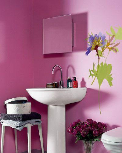 粉色油漆粉飾過(guò)的墻面,顏色雖然亮麗,但單一色調(diào)的墻面依然給人狹小感,而用防水性好的漆料在墻面繪制一幅綠色的花枝圖案后,墻面像是被注入了生命活力,充滿了立體感,空間也覺(jué)得比之前變大了一些。