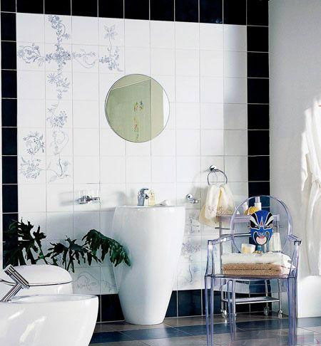 在配有淋浴和浴缸的衛(wèi)浴間里,用黑白兩色小馬賽克設(shè)計(jì)地面,拼成黑色和白色相間的水波紋理,整間浴室就化身為水上世界,浴缸、潔具、家具都好像漂浮在水面上,而墻壁上的花紋彩繪,令衛(wèi)浴生活變得新奇又浪漫。