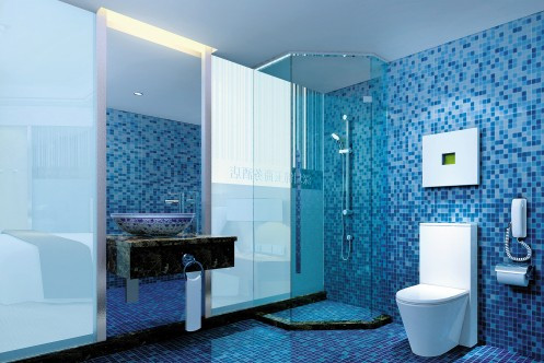 衛(wèi)浴空間的墻面、地面多數(shù)鋪設(shè)瓷磚,由于瓷磚的品種圖案十分豐富,巧妙地構(gòu)圖拼貼可使其變化多端,出現(xiàn)各種風(fēng)格情調(diào)。在衛(wèi)生潔具造型花樣繁多,且價(jià)格越來(lái)越昂貴的情況下,重點(diǎn)處理裝飾墻面、地面,將收到事半功倍的效果。