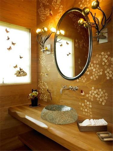 小編的話:如果更喜歡耀眼的風(fēng)格那么不必局限于簡約的木制盥洗臺,盡可以選擇這樣一種背景墻讓浴室流光溢彩。尤其是窗戶上的蝴蝶栩栩如生的感覺,讓浴室生動起來。