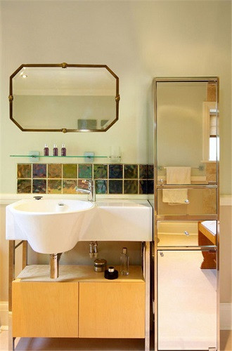 小編的話:這間浴室背景墻上鏡子的材料使用和裝飾選擇讓本來強(qiáng)烈的純白浴室在復(fù)古里面柔和。兩邊盥洗盆和鏡子看似對稱卻并不對稱的設(shè)計(jì)個(gè)性十足。