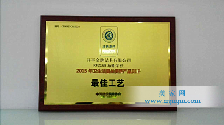 2015年度金牌衛(wèi)浴所榮獲的“金馬桶—最佳工藝”殊榮牌匾