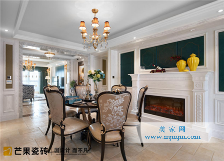 降低飽和度的墨綠色帶著一種輕盈的時尚魅力,搭配明黃瓷器擺件,跳脫卻又不失穩(wěn)重。精致雕花雕刻出純白潔凈的壁爐,帶來煙火氣的同時又兼具美觀性。藕粉系餐椅應(yīng)和著柔美恬淡系地磚,不動聲色,卻相互融合地剛剛好。