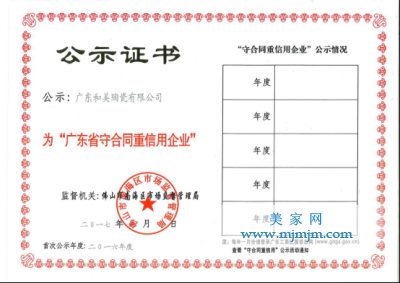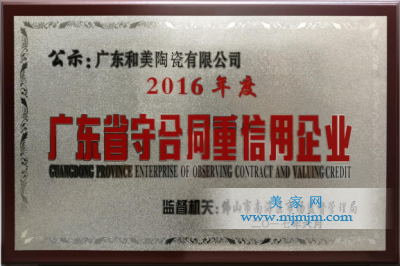 2017年6月,經(jīng)佛山市工商局的專項考察評選,廣東和美陶瓷有限公司憑借18年來的誠信經(jīng)營和良好的合同履約信用,通過了“2016年度廣東省守合同重信用企業(yè)”申請,并榮獲此殊榮。