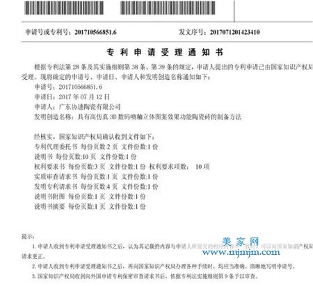 本次新品均按照國(guó)家標(biāo)準(zhǔn)GB/T4100-2015《陶瓷磚 附錄G 干壓陶瓷磚(E≦0.5%BIa類)》、國(guó)家標(biāo)準(zhǔn)GB6566-2010《建筑材料放射性核素限量》清晰地展示了性能指標(biāo)。樂總監(jiān)自豪地介紹項(xiàng)目技術(shù)和產(chǎn)品已申請(qǐng)發(fā)明專利1件(“具有高仿真3D數(shù)碼噴釉立體圖案效果功能陶瓷磚的制備方法”申請(qǐng)?zhí)枺?01710566851.6)。
