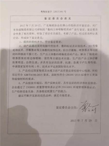 2017年7月29日上午10時(shí),廣東恊進(jìn)陶瓷有限公司珈納品牌摩卡館內(nèi),對(duì)公司研制的“數(shù)碼立體噴釉瓷質(zhì)磚”產(chǎn)品進(jìn)行鑒定。本次鑒定會(huì)特邀廣東陶瓷協(xié)會(huì)多名專家到場(chǎng),對(duì)高仿真3D數(shù)碼噴釉功能立體圖案效果陶瓷磚及其制備方法進(jìn)行公開展示,并進(jìn)行學(xué)術(shù)報(bào)告。